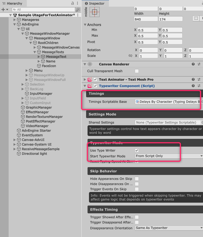 サンプルでは、宴やTextAnimatorのSampleを流用して設定を行っているため、それらを削除していない状態で試してください。