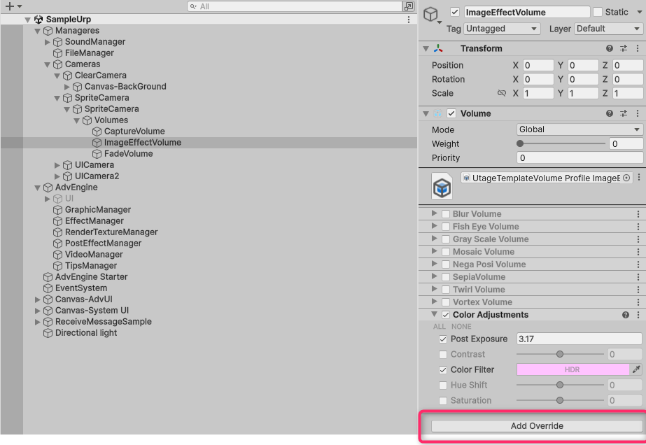 SpriteCamera以下のVolumes>ImageEffectVolumeにあるVolumeProfileに「Add Override」でポストエフェクトを追加